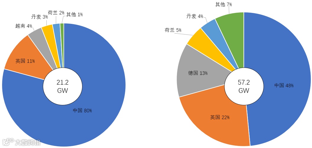 图1 截至2021年全球主要国家海上新增(左)及累计(右)风电装机容量(数据来自CWEA)