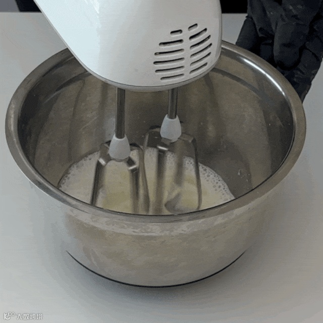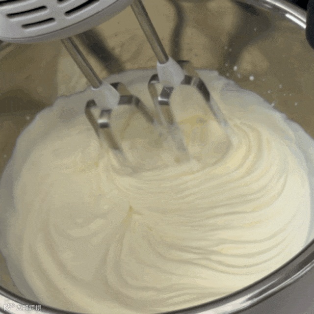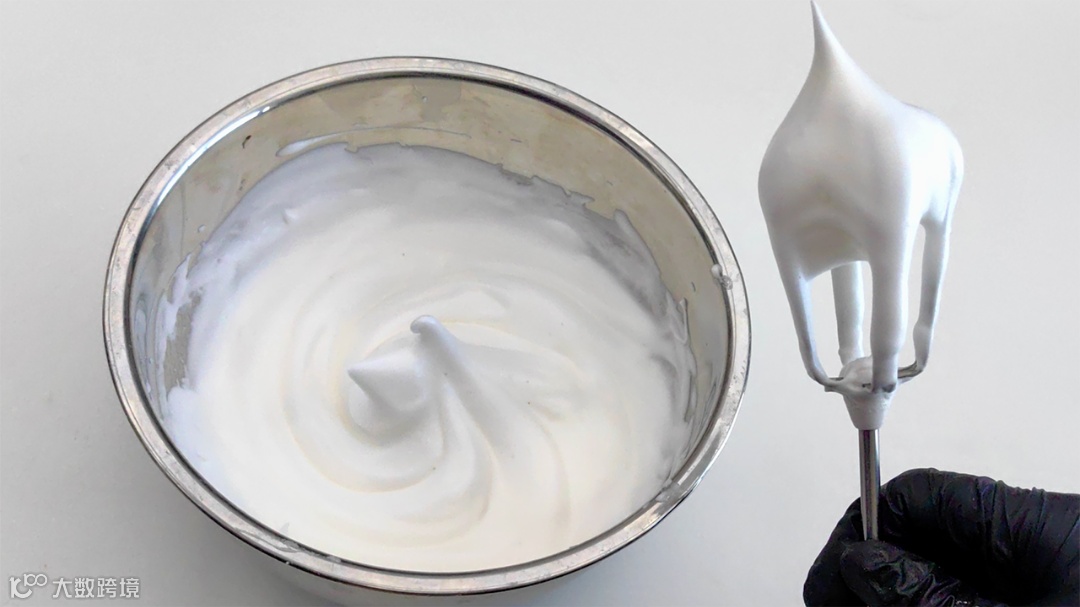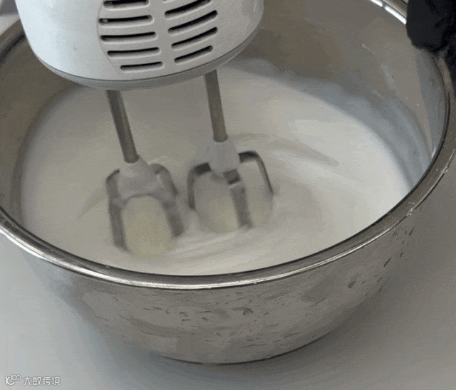 在蛋清内加入几滴柠檬汁后打发,分三次加入细砂糖,提起打蛋器,蛋白霜呈小弯钩形状且稳定细腻有光泽,即可进行下一步。
