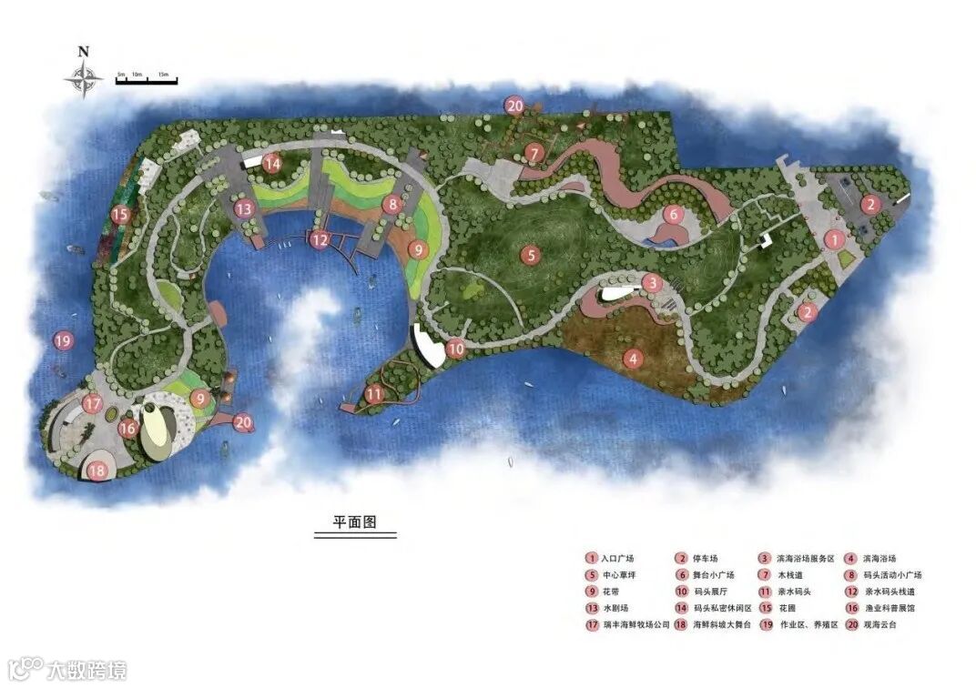 本研究依托综合型海洋牧场和景观规划设计的相关理论,针对鲅鱼圈润丰海洋牧场的发展状况,从多产业联动、生态环境保护和综合效益提高的角度,提出现代化综合型海洋牧场的景观规划设计方案。以修复生态环境、打造属地景观、融合周边产业和促进经济发展为原则,将润丰海洋牧场划分为5个功能区,以道路设计和建筑小品造景设计为辅助,深入挖掘区域文化内涵和自然资源特色,建设以海洋渔业文化为主题以及集多重功能于一体的现代化综合型海洋牧场。其中,海洋方面将通过专业的增养殖手段显著恢复渔业资源,陆地方面将呈现和谐的景观序列,陆海同向发力将有效改善生态环境。同时,各功能区的协调发展可促进不同产业之间的互联互通,有助于形成完整的产业链,符合现代化海洋牧场建设的发展趋势。