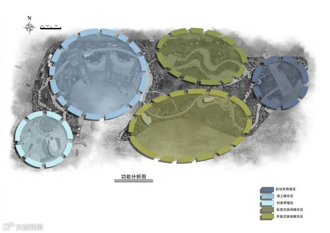 根据项目定位和区域环境,将润丰海洋牧场划分为5个功能区,即增养殖和科普区、滨水活动区、入口广场服务区、开放式休闲娱乐区以及私密式休闲娱乐区(图2和图3)。