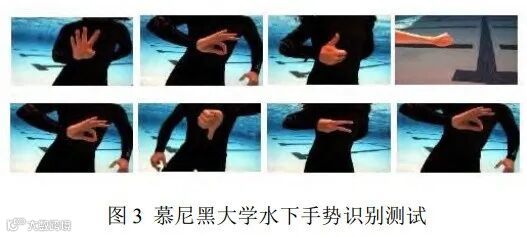 在智能手势识别技术研究方面,美国麻省理工大学使用三轴加速计设计了一个可穿戴在手指上的数据采集和识别系统,采用基于预分类的改进型隐马尔科夫算法作为分类器,16个手势动作的平均识别率为85%。加拿大西蒙大学基于表面肌肉电信号和陀螺仪识别技术,通过8通道电极片紧贴皮肤表面,结合陀螺仪测量手臂空间移动动作数据,实现6个动态手势识别[7],但8通道电极片必须紧贴在特定手臂皮肤表面,舒适度较低,不适合水下环境。总的来说,智能手套的舒适性有待提高,距离实际应用还有改进空间。为此,德国慕尼黑工业大学利用基于机器视觉的图像识别技术开发了水下手势识别系统[8],并首次开展了水下测试,达到94.81%的识别率,该技术有望为蛙人指令通信提供新的技术途径。