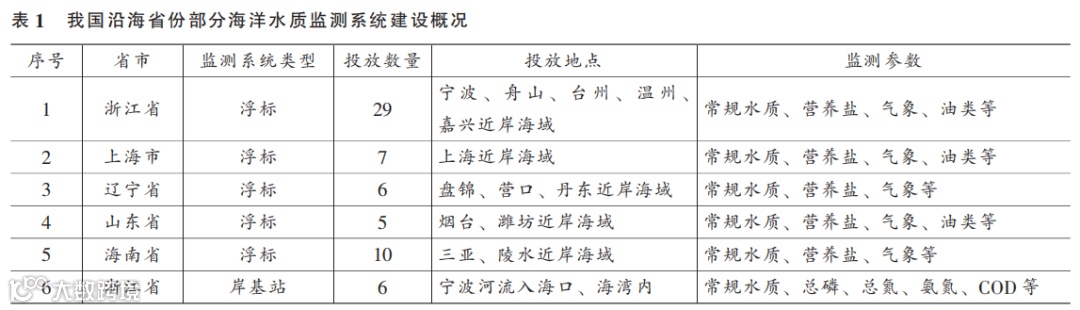 相比于内陆地表水的在线监测, 由于海洋环境多变、 海洋水质复杂, 海洋水质在线监测对监 测系统的整体可靠性、 设备材料的防腐蚀性、 仪器测量方法的可行性等有更加严苛的要求。随着水质监测行业与海洋产业的迅速发展, 我国沿海地区的海洋水质监测工作也正在大面积开展起来。国家海洋局编制了 《国家海洋环境实时在线监控系统总体布局及建设思路》, 在 “十三五” 期间, 大力推进海洋环境实时在线监控系统能力建设。在线监测的主要方式包括浮标、 岸基站、 固定平 台及其他海上平台搭载在线监测设备 [3]。据统计, 从 2011 年至今, 仅杭州瑞利海洋装备有限公司承 接的浙江省、 上海市、 海南省、 辽宁省、 山东省 等沿海省市的海洋水质监测浮标系统就达到 50 多 套, 监测参数包括常规水质多参数和营养盐参数,如表 1 所示。部分浮标除了水质参数外, 还包括气象、 水文、 油类、 核辐射等参数, 为海洋生态环境保护和防灾减灾提供决策支撑, 为社会公众 提供海洋生态环境状况实时信息服务, 为节能减 排提供环境基础资料。2018 年, 国家对各个职能 部门进行重新整合, 国家成立了生态环境部, 使 得监测领域扩大, 海洋水质监测与内陆地表水水质监测之间的交叉融合也越来越多, 类似于地表水水质自动站的近岸海域岸基站水质在线监测系 统的建设也逐步开展起来, 对入海污染物以及海洋水质重要参数进行实时在线监测, 为相关部门 对海洋环境管理提供了有力的数据支撑 [4]。本文 对我国近些年海洋水质监测的发展现状进行整理 总结, 并对其需要改进的方面进行探讨, 以期为海洋水质监测的发展改进提供参考。