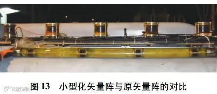 该系统的湿端为4个矢量水听器子阵组成的线列阵,矢量水听器子阵如图12所示。为进一步优化矢量水听器线列阵的适装性,团队还进行了矢量水听器阵小型化设计,以提高无人平台航行时的机动性能,小型化矢量水听器线列阵与原矢量阵的实物对比如图13所示。
