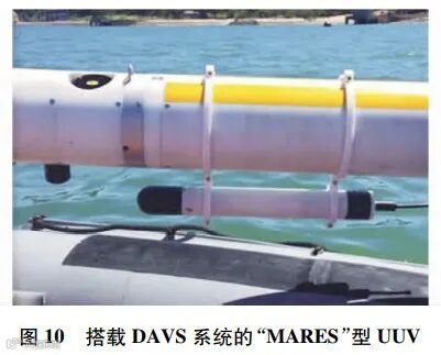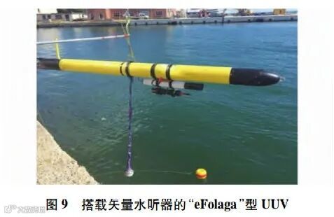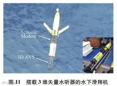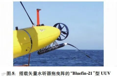 随着减震降噪技术的发展,水中目标的声隐身性显著提高。而为了提高与之相对抗的自主探测能力,需要进一步增加声呐的阵元个数和阵列孔径,但受限于无人平台的尺寸以及布放、回收等实际操作需要,这一要求往往难以满足。矢量水听器的出现为该问题的解决指出了新的方向[23-24]。相比于传统声压水听器,矢量水听器兼有声压的和相互正交的质点振速分量输出通道,能够提供更为全面的声场观测结果,与此同时,其体积小、重量轻,对发展小平台声呐系统具有重要意义。研究表明,不同于声压传感器的全指向性,振速传感器阵元本身就具有偶极子指向性,利用这一特性,从干扰抑制的角度来看,单个矢量传感器就具有对空间中的点源强目标干扰信号的抑制能力,而从方位估计的角度来看,单个矢量传感器就可以从振速场中提取出目标的方位信息,从而实现360°的无模糊定向;另一方面,利用远场点源信号和环境噪声在声压振速相关性上的不同,单个矢量水听器在各向同性噪声场中能获得一定的空间增益,提高在低信噪比环境下的信号处理能力。基于这些优势,成阵后的矢量水听器阵列能够在相同的布阵条件下,达到更好的强目标干扰抑制能力、更好的空间分辨能力以及更高的空间处理增益,为在复杂的水声环境下提高声呐系统的远程目标探测能力提供了物理基础[25]。近年来,已经有多个外国研究机构尝试在无人平台上搭载矢量水听器,以执行自主探测任务。美国麻省理工大学将一条长为100m矢量水听器拖曳阵搭载在“Bulefin-21”型UUV上,实现了对舰船的探测和跟踪[26],如图8所示。意大利比萨大学与意大利海军和北约科技组织海事研究和实验中心(Center for Maritime Research and Experimentation,CMRE)合作,利用搭载在“eFolaga”型UUV上的单矢量水听器,实现了对1kHz线谱目标的实时被动检测与方位估计[27],如图9所示。葡萄牙海军研究中心与葡萄牙大学合作,将双加速度计矢量水听器(dual accelerometer vector sensor,DAVS)搭载于“MARES”型UUV上,成功实现了对目标的定位[28-29],如图10所示。CMRE还尝试将三维矢量水听器加装于水下滑翔机上,以实现对水声目标的定位[30],如图11所示。