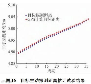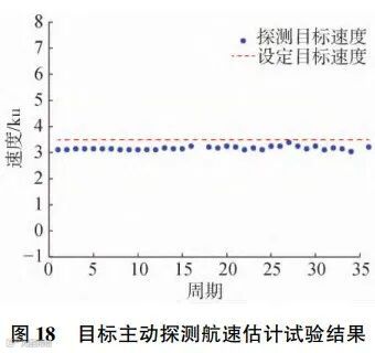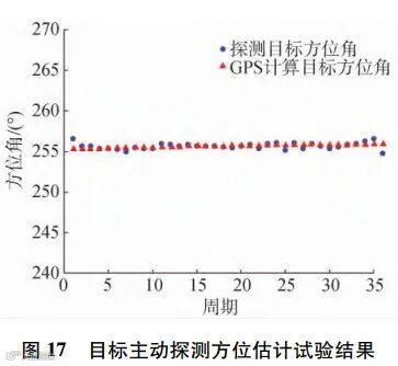下面给出该系统主动工作模式下的探测结果。图16~18分别给出了探测声呐对目标回波信号的测距、测向以及测速结果,其中三角表示GPS测量的水平方位和距离结果,实线表示目标模拟回波发射的真实速度,点表示各周期下主动探测声呐系统对距离、方位以及径向速度的估计结果。从图中可以看出,工作在主动模式时,无人平台自主探测声呐能够对目标的距离、方位和运动速度实现精确估计,探测性能优越。