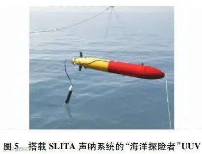 北大西洋公约组织的水下研究中心(NATO Undersea Research Centre,NURC)也很早就投入到了无人自主探测声呐的研究之中,并在2009年完成了一次基于UUV的双基地声呐自主探测试验[20]。在该试验中,NURC在海底布置了声源作为发射站,并将自研的细拖曳阵声呐系统(slim towed array,SLITA)搭载在“海洋探险者”UUV上,作为接收站,如图5所示。“海洋探险者”长度为4.5m,直径0.53m,当搭载拖曳阵声呐时,其最高航行速度为3kn,续航时间7h。SLITA拥有83个换能器,最多可同时配置其中的32个。该声呐目前提供了4种工作阵元配置,所对应的工作频带覆盖了714Hz~3471Hz的范围,使声呐可以工作在较低频的被动模式与较高频的主动模式。该套声呐系统可基于实时探测结果对UUV的运动进行自动规划,使SLITA的法线方向自适应指向目标方位,以扩大阵列的有效孔径,提高方位分辨率。