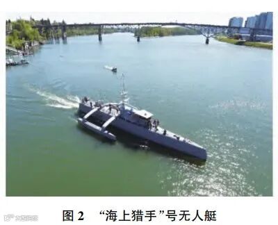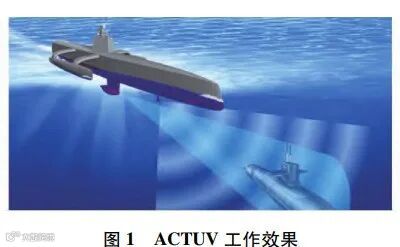 为应对未来安静型潜艇所带来的威胁,世界各国都在努力研制基于无人平台的自主探测系统。美国国防高级研究计划局(Defense Advanced Research Projects Agency,DARPA)于2010年启动了“反潜战持续跟踪无人水面艇”(anti-submarine warfare continuous trail unmanned vessel,ACTUV)研究计划[8]。DARPA希望借此计划开发出成本较低的USV,以实现对敌方潜艇的长时间、大范围的自主跟踪,如图1所示。2016年,ACTUV计划的首艘技术验证艇“海上猎手”号下水,如图2所示。作为世界上最大的无人水面舰船,其最大长度39.6m,最高航速27kn,作战半径达到3000km,可以连续执行反潜任务至少70d[9]。“海上猎手”号执行反潜任务的核心声呐设备是由美国雷声公司提供的模块化可扩展声呐系统(modular scal able sonar system,MS3),MS3声呐系统是雷声公司生产的SQS-56中频舰载声呐的第5代产品,其主动探测距离达到18km,同时具有主被动探测与跟踪、鱼雷预警以及自动避障等功能[10-11]。借助于MS3声呐系统,“海上猎手”号即可以对水下的当前情况和突发威胁进行自主判断。为了让MS3声呐系统适应无人平台,雷声公司对声呐进行了重新设计和改进,大幅减少了元器件的数量,同时采用光纤水听器作为声呐的接收阵元,在提升灵敏度的同时,还降低了重量和功耗[11]。