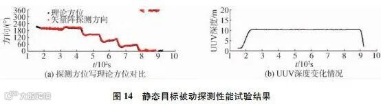 首先给出了静态目标的被动探测结果。目标探测结果如图14所示,其中参考基准方位由水下无人平台内记的导航数据结合声源GPS坐标计算得到。无人平台在水下航行过程中,矢量阵自主探测系统将目标探测结果实时提供给无人平台,同时进行数据内记,下图显示的均为无人平台内记数据的回放。从图中可以看出,该矢量阵探测系统可实现360°全向、无左右舷模糊的自主探测,且具有低虚警概率和低漏报概率的特点。