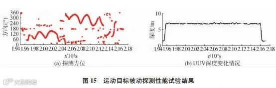 下面给出了运动目标的被动探测结果。本试验以运动小艇为探测目标。小艇在水面自由航行,UUV在水下7m运行,跟踪水面目标,目标探测结果如图15所示。从图中可以看出,运动小艇的方位轨迹清晰,目标探测性能优越。