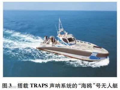 “海鸥”号是以色列埃尔比特系统公司研发的一种自主式多用途无人水面艇,可执行反潜战、反水雷战、电子战等多种任务。为了让“海鸥”号在反潜战中更好地发挥作用,该公司已与多个机构合作,尝试将探测声呐安装于“海鸥”号上。最初,以色列海军曾对著名的直升机远程主动声呐(helicopter long range active sonar,HELRAS)进行了改进,并安装在“海鸥”号上使用[12]。2020年4月,美国GTI公司和Curtiss-Wright公司合作研发的收放式主被动拖曳声呐(towed reelable active passive sonar,TRAPS)被集成在“海鸥”号上[13],如图3所示。该声呐结合了垂直主动发射阵与被动拖曳阵,具有小巧、轻便、成本低的特点,无需复杂的系统完成拖曳阵的收放,十分适合于应用在UUV、USV等小型平台上。GTI公司声称,该声呐系统可工作于低、中、高频,且具有左右舷分辨、实时多目标探测、定位、跟踪和识别等能力[14]。2020年6月,在英国国防部的组织下,“海鸥”号在英国近海进行了试验。在这次试验中,“海鸥”号上搭载了美国L3哈里斯公司研发的声呐,证明了“海鸥”号的自主反潜能力[15]。