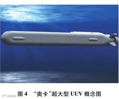 除USV外,各国也十分重视利用UUV来执行未来的反潜任务。DARPA于2016年提出了移动舷外秘密通信与途径(mobile offboard clandestine communications and approach,MOCCA)计划,旨在提升潜艇的探测距离,并降低自身被锁定的风险[16]。MOCCA计划寻求主动声呐探测解决方案,以弥补潜艇搭载的被动声呐的缺陷。MOCCA计划的核心是一种工作在潜艇舷外的UUV,该UUV小于21英寸,具备在水中复杂环境下工作的能力,搭载高性能主动探测声呐,同时还能将探测信息实时、秘密地传送给己方潜艇[17]。BAE系统公司获得了MOCCA第1阶段的研究合同,致力于解决UUV搭载的主动声呐的效率问题,以提升探测能力[18]。2019年,美国海军正式向波音公司订购了4艘“奥卡”超大型UUV,如图4所示。“奥卡”由波音公司的“回声旅行者”型UUV改造而来,可用于执行反潜作战、反水面舰作战、反水雷作战等任务[7,19]。美国海军希望在“奥卡”舷侧设计72或96元水听器声呐阵列[7],以探测敌方潜艇的位置。在将情报发送给水面舰与反潜直升机的同时,“奥卡”还能对敌方潜艇进行长时间的自主跟踪,并利用其携带的重型鱼雷实现自主攻击。