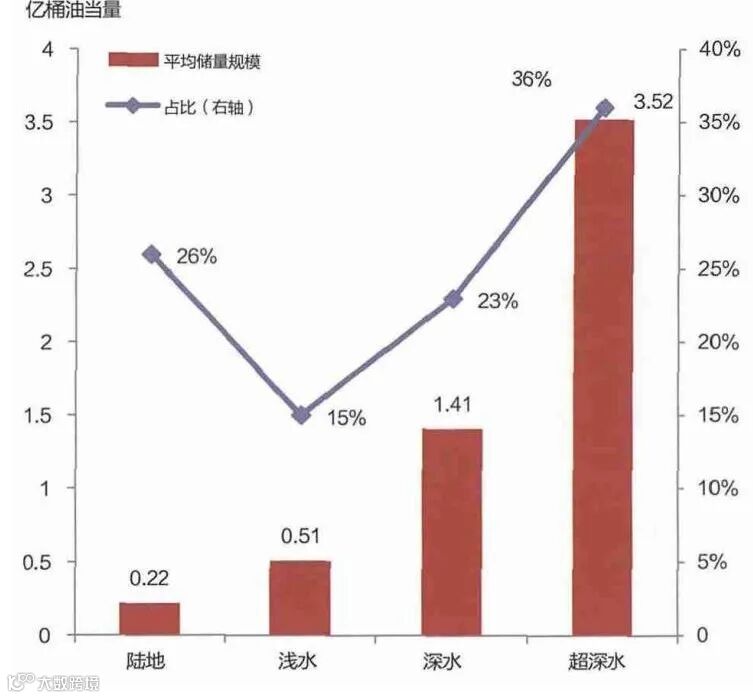 据IHS统计,近10年全球新的油气发现有74%的分布在海域,其中深水占23%,超深水占36%。从新发现油气的储量规模来看,海洋油气的储量规模远高于陆地;其中,超深水油气平均储量为3.52亿桶当量,是陆上规模的16倍。