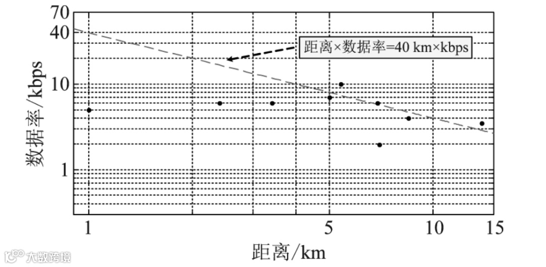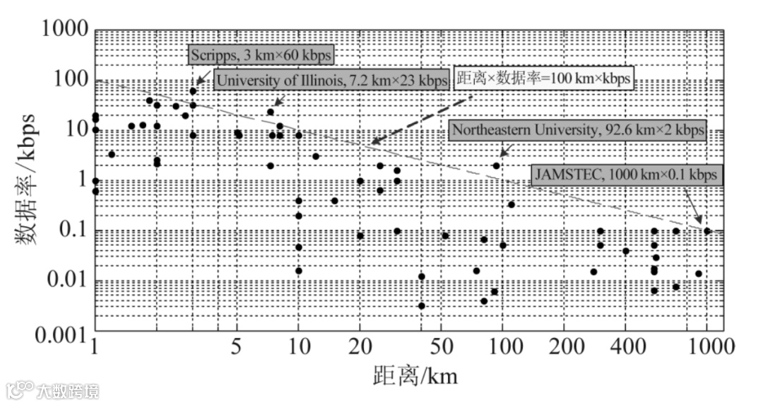 2000 年,美国麻省理工学院的 Baggeroer 等人以 I=最大通信距离×通信速率为考察标准,总结以往水声通信系统性能,给出了 2000 年以前水声通信系统性能经验性的上界:I=40 km× kbps,这也成为了水声通信领域衡量整体技术发展水平的重要量化指标。随着水声通信技术的快速发展,21 世纪的水声通信系统性能已经发展到了一个新的水平,西北工业大学的黄建国教授对 2000 ~ 2017 年的通信距离 30 km 以内的水声通信科研实验结果进行统计分析,得到水声通信系统性能上界已经接近 I =100 km×kbps 的结论。