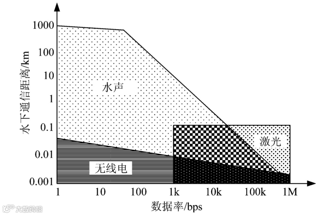 水下通信主要有电磁波、光波和声波等几种信息载体,图 1 为几种主要水下通信方式的通信距离与通信速率性能比较。由于水体对于电磁波具有明显的屏蔽作用,水下的电磁波通信距离一般仅在百米以内; 光波在蓝绿波段对于水下通信存在一个可用窗口,可在百米量级上实现高数据率的数据通信,但继续提高通信距离难度很大; 低频声波在水中的传播损失较小,当前可实现最大通信距离上千公里,最大通信速率 10 ~ 100 bps 的数据传输,这也使得水声通信成为百米以深的海区中当前唯一成熟可用的远距离通信方式。