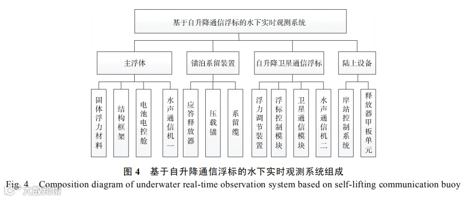 基于自升降通信浮标的水下实时观测系统由主浮体、锚泊系留装置、自升降卫星通信浮标和陆上设备等组成。