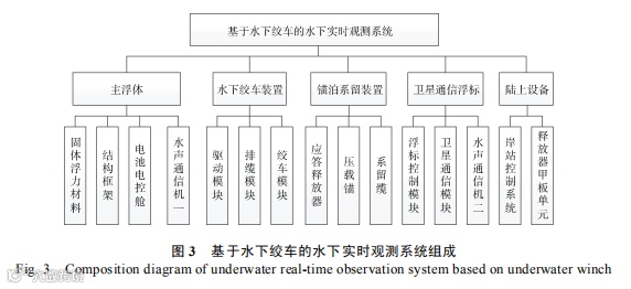 基于水下绞车的水下实时观测系统主要由主浮体、水下绞车装置、锚泊系留装置、卫星通信浮标和陆上设备等组成。