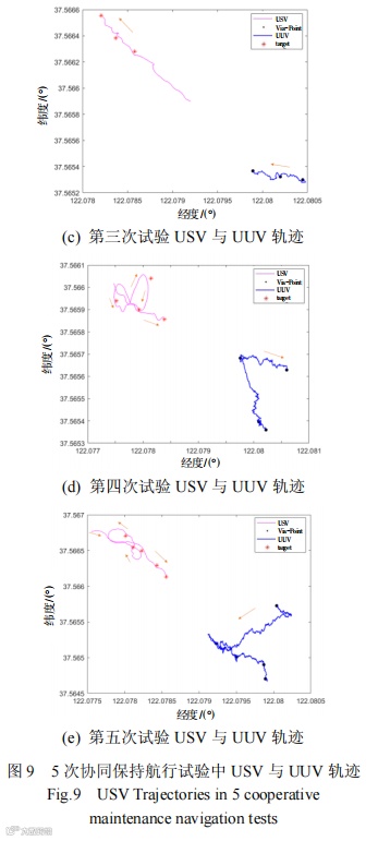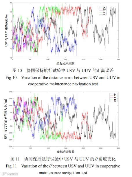 协同保持过程中的数据如图 9 所示,红色和黑色点分别为通过协同保持算法计算出的保持 USV 与UUV 距离 200m 时目标点和经过点,紫色路线为 USV运动轨迹,蓝色路线为 UUV 运动轨迹,箭头为运动方向,共开展五次航行实验。从测试数据可以看出,USV 可以保持预设的相对距离和角度,全程可与 UUV进行有效的协同导航,相对位置误差控制在 15m 以内(第四、五次实验航行受到海流影响),相对角度 一直满足式(9)约束,变化在 1以内,如图 10~11 所示,协同保持方法具有较好的效果。
