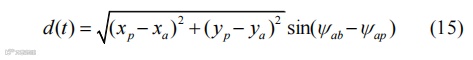 式中, ab为矢量AB与 y 轴的夹角,表示该航路段的计划航向。船舶的位置偏差是 P 到直线 AB 的垂直距离,在计划航线的左侧为正,右侧为负,计算公式如式(15)所示。