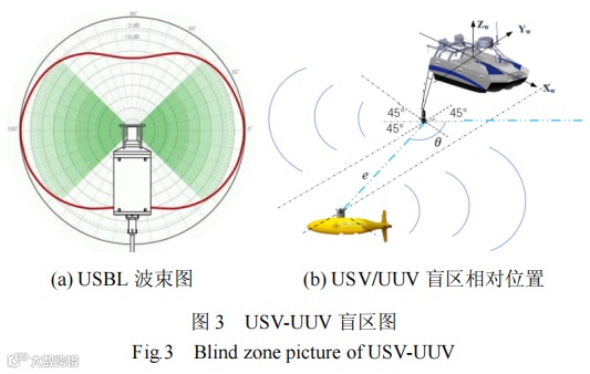 由于 USBL 的有效通信定位距离和波束角有限(本文USBL 波束角范围是周向 2π,轴向π 4),当 USV 和 UVV处在特定角度和位置时,会进入信号盲区,如图 3 所示。此时 USV 和 UUV 之间无法有效进行通信、定位,协同导航不稳定、不连续。