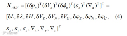 使用USV 上高精度INS 与GNSS 导航信息与USBL 定位信息来校正 UUV 的导航误差,进而提高 UUV 导航精度。选择 UUV 惯导设备的经纬度和高度位置误差δpn、三个方向的速度误差δVn、姿态误差δn、陀螺漂移 n和加速度计偏置误差n构构建 15 维系统状态变量:
