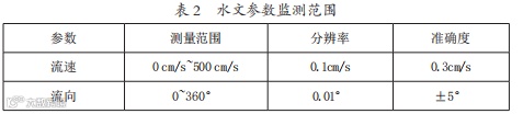 水文监测主要包括海水流速、流向和海水水质等。该系统采用海流测量仪,基于声学多普勒技术测量流速和流向,具有测量范围广、精度高、准确性强的特点,具体参数见表2。并且海流测量仪设计紧凑、坚固耐用、操作简单、无活动部件、抗生物附着性强,可采用船载固定支架进行布放。