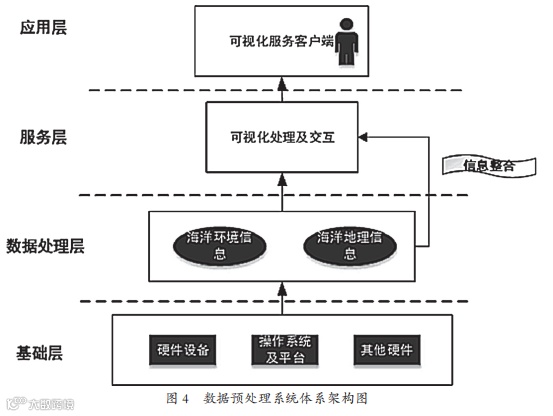 数据处理层 :提供服务层使用的各种可视化数据资源,包括海洋地理信息数据、海洋环境信息数据以及各种实体模型等,并对数据进行必要的整合、加工、处理和标准化。