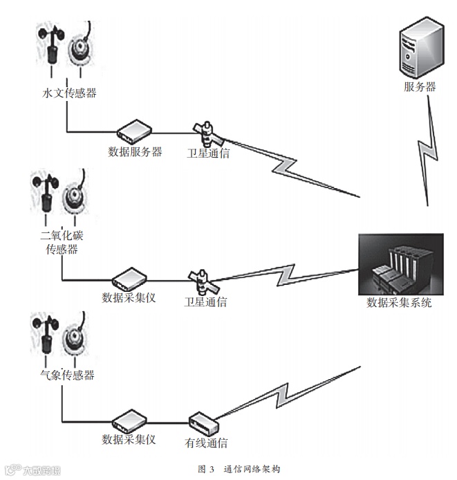 根据现场监测系统的环境条件不同,系统针对不同的监测设备和平台采用不同的通信方式。由于气象水文监测与大气检测单元主要布置在海面以上,所以通信方式选择较为方便、快捷的电缆传输和卫星传输。检测单元的数据通信技术包括浮标连接卫星通信和平台监测仪直接通过电缆进行通信 2 个部分。数据收发模块通过北斗网络实现现场和数据采集系统之间的无线数据传输,一方面负责把数据采集仪采集到的数据发送至采集系统;另一方面,接收从数据采集系统发来的指令,通过这个功能,可以实现仪器设备的远程操控。通信网络架构如图 3 所示,数据传输采用目前最稳定的北斗 /GPRS/CDMA/3G/4G,中控室操控人员可以直接接收数据、发送指令。平台监测仪则通过电缆与数据采集系统直接相连进行通信。坐底式观测平台采取水声通信方式。其主要优势为结构紧凑、简单实施,高速率数字通信,准双工数据传输,先进的多路径抑制,内置前向纠错和数据压缩,有保障的数据传输,最高可达 8 个可调整优先顺序的数据流,不间断数据流的顶部传输实时讯息,UW 网络特性,低能量损耗,内置相对速度和测距,通信时可跟踪,可扩展 USBL 模块,信号完整性和多路径结构诊断,带有先进命令集的透明串口,OEM 选项和系统集成服务。