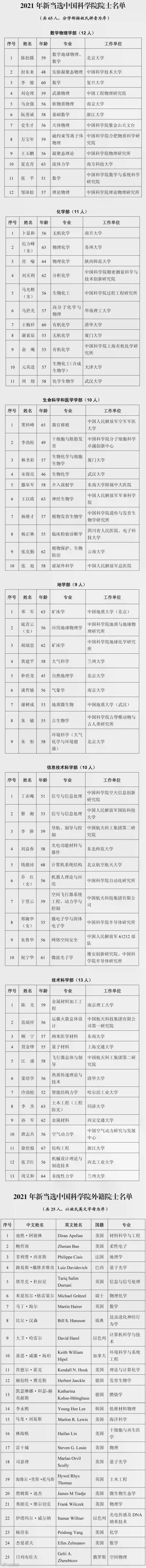 根据《中国科学院院士章程》《中国科学院院士增选工作实施细则》《中国科学院外籍院士选举办法》等规定,2021年中国科学院选举产生了65名中国科学院院士,有5位女性科学家当选。新当选院士平均年龄为57.4岁,最小年龄为45岁,最大年龄为68岁,60岁(含)以下的占76.9%。其中,数学物理学部12人,化学部11人,生命科学和医学学部10人,地学部9人,信息技术科学部10人,技术科学部13人。通过特别推荐评审机制,国防和国家安全领域有5人当选,新兴和交叉学科领域有3人当选,院士队伍结构得到进一步优化。此外,新当选中国科学院外籍院士25人,分别来自11个国家,韩国和瑞士首次有科学家当选中国科学院外籍院士。本次增选后,中国科学院共有院士850人,外籍院士129人。