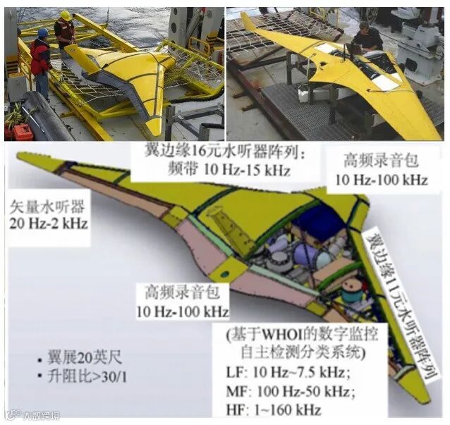 美国斯克里普斯海洋研究所海洋物理实验室和华盛顿大学应用物理实验室合作设计的翼身融合水下声学滑翔机(XRay 和 ZRay), 采用翼身融合结构,可实现翼展水平距离最大化和功率消耗最小化,最大限度地提高其探测和定位能力。该滑翔机利用独特的翼身融合设计可获得较快的水下航行速度,使升力面积最大且增加了内部体积,可用携带战术有关的声学传感器,使其适合于警戒和其他遥测任务。ZRay 的两机翼前缘中安装了1个27元水听器阵列,水听器工作频带10赫兹~15千赫,阵列信号输出到1个实时检测/定位和记录系统;该水下声学滑翔机同时搭载有矢量水听器,频率为20赫兹~2千赫。除此以外,ZRay 还尝试拖曳1个32元拖曳线列阵,该阵列由太平洋空间和海军作战系统中心设计和建造,并将配备1个来自伍兹霍尔海洋研究所的3通道低(10赫兹~ 7.5千赫)、中(100赫兹~ 50千赫)、高(1千赫~160千赫)频数字监控自主检测分类系统。该水下声学滑翔机可以1~3节的航速续航6个月,其设计初衷是用来跟踪和自动识别海洋哺乳动物,目前已应用于圣地亚哥海底被动声学自主监测海洋哺乳动物项目 (Passive Acoustic Autonomous Monitoring of Marine Mammals Program)。由于其优异的声学探测性能,ZRay 还可用来探测安静级柴电潜艇,是美军持久性沿海海底监视网(Persistent Littoral Undersea Surveillance Network, PlusNet) 的一部分。