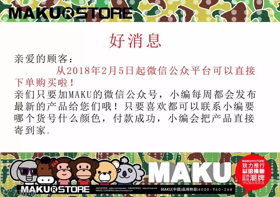 微信新店开张,用微信平台购买的MAKU品牌全部以吊牌价7.3折计算,MEILY&KELLY品牌立减100元。(立减后不参与任何活动)