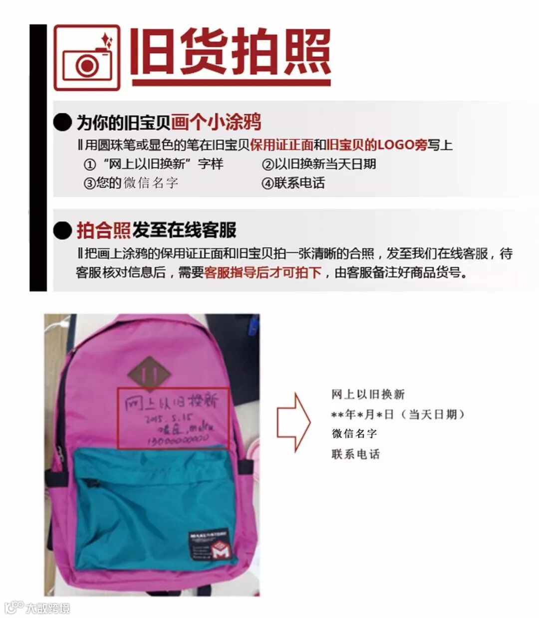 第四步:在旧包上填写(以旧换新字样+日期+微信名字+联系电话)然后拍照给小编哦!如下参考图: