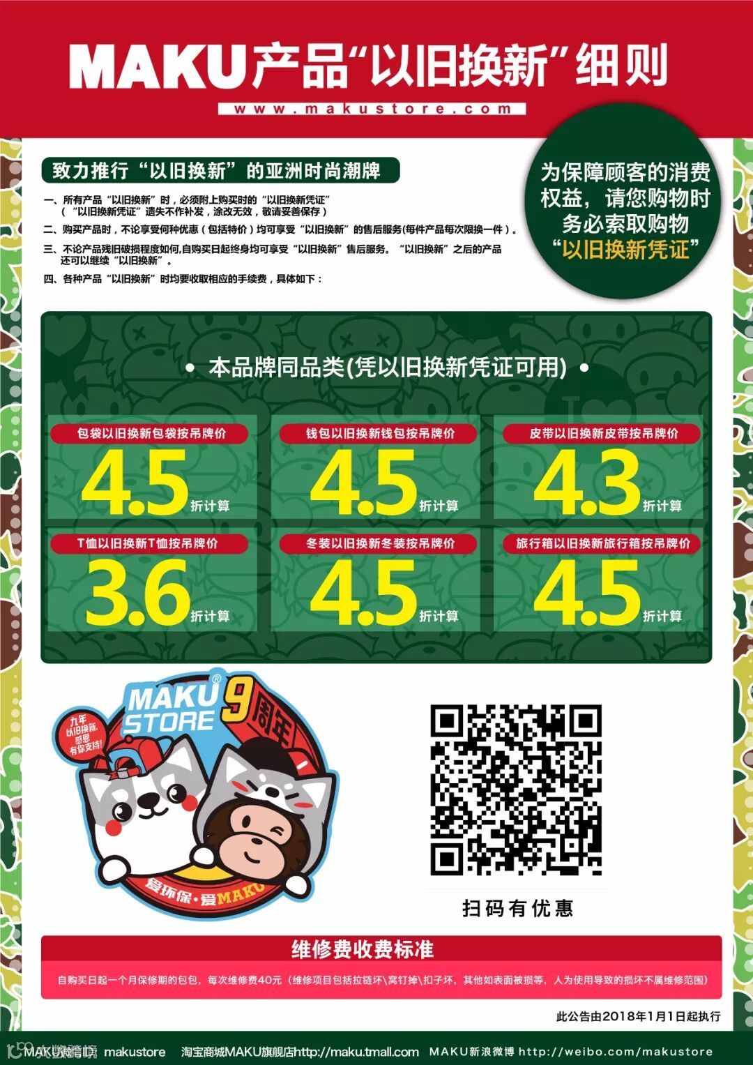 亲,如果您们没有购买过MAKU的产品或者以旧换新卡不见了,现在有好消息告诉您,只要你拿任何一个坏包,烂包都可以享有5.5折优惠哦!(活动结束时间2月28号)