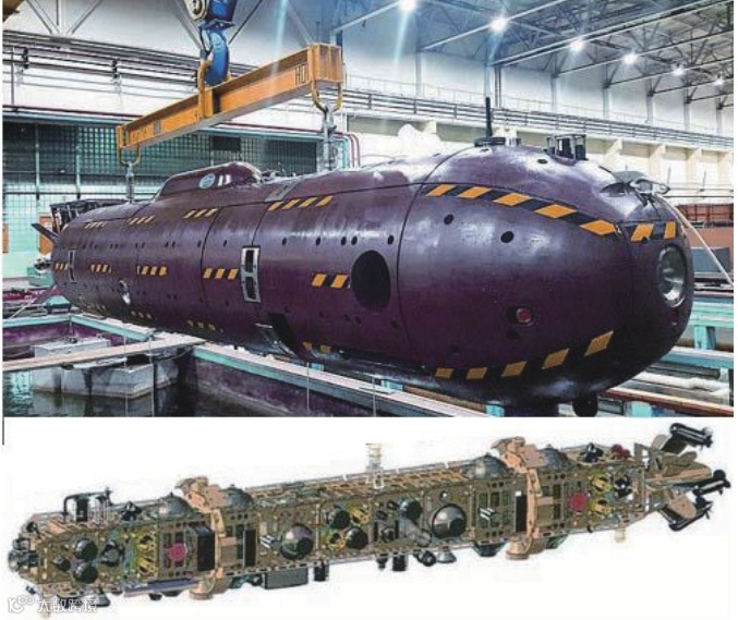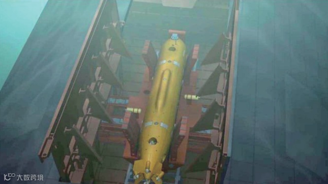 该型UUV可由水面舰艇或潜艇携带,图7为俄罗斯媒体公布的在核潜艇上层建筑的透水空间内驼带“大键琴”重型UUV的画面。该UUV不携带武器,配置有侧扫声呐、电磁传感器和摄像机等多种传感设备,可执行情报监视和侦察(ISR)、海底成像、海底扫描、海洋科考等军民任务。