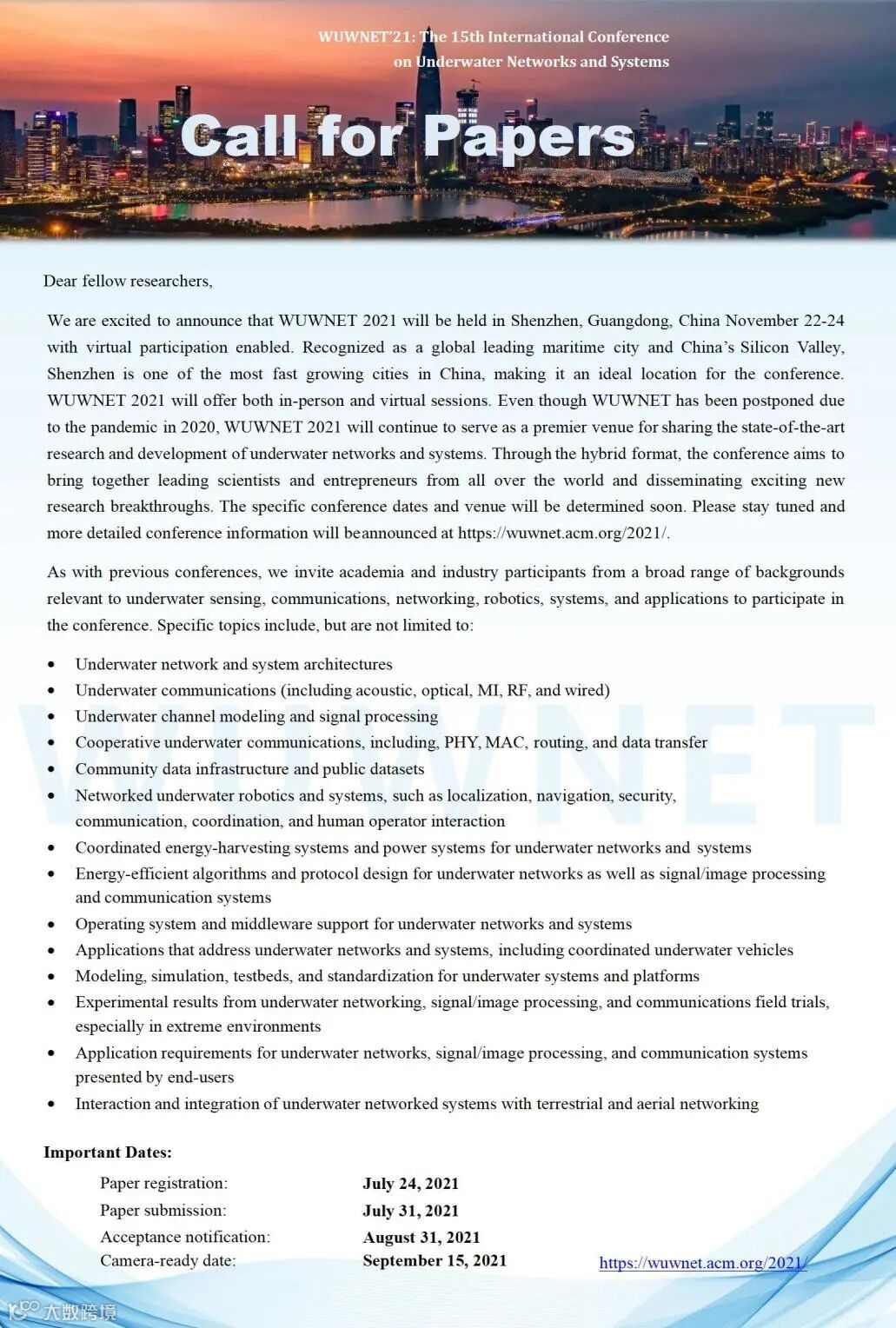 我们很荣幸地宣布WUWNet’21会议将于11月22日至24日在中国广东深圳举行,提供现场和远程在线两种参会方式。深圳被公认为全球领先的海洋城市和中国硅谷,是中国发展最快的城市之一。尽管受疫情影响,2020年的WUWNet会议被推迟,WUWNet’21会议旨在继续作为分享水下网络和系统最新研究进展的首要国际论坛,供来自世界各地的顶尖科学家、企业家和研究人员聚集在一起交流最新研究突破、进展和实践。具体会议地点将于近期公开。更多详情敬请关注https://wuwnet.acm.org/2021/。