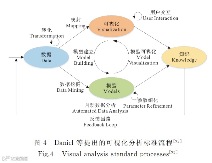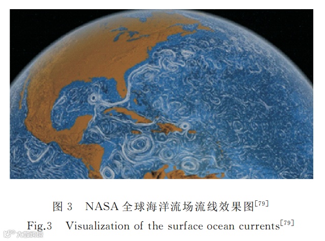 海洋可视化领域起源非常早,中世纪时期,人们就开始使用表示海洋主要风向的箭头图和天象图,随着计算机图形学的发展,可视化从单一的创建图形图表,发展到利用更高级的渲染技术创建更复杂的可视化模型。目前,海洋可视化工作从数据类型上区分,主要包含矢量场可视化及标量场可视化,其中矢量场可视化采用的方法主要有:图表法,几何法[74-75],纹理法[76],拓扑法[77]。其中Jobard等人最早进行了基于纹理和粒子追踪的流场可视化方法研究[75,78],为复杂流场可视化奠定基础。NASA下属的科学可视化工作室目前已完成超过5300个海洋可视化视频,其中利用流线技术完成的“Perpetual Ocean”视频[79],发布后引起了海洋学家的广泛关注,效果如图3所示。在标量场可视化算法方面,主要集中在体绘制算法方面研究,其中加州戴维斯马匡六团队在大规模体绘制[80-82]、实时光照[83-84]、多变量特征提取[82,85]等方面都取得相应成果。此外,在科学可视化分析平台方面,Word Wind平台、Skyline平台、OSG平台及Google Earth均可进行海洋或大气环境等的仿真及可视化[86-87],许多工作亦基于此进行二次开发及研究[72,88]。陈戈等基于MVAR架构搭建了i4Ocean平台,并进行了基于LIC及Ray-Casting算法的海洋可视化相关工作研究[89-91]。在海洋可视化分析方面,其基本理论与方法,仍然是正在形成、需要深入探讨的前沿科学问题。Danie等提出了可视化分析流程[92],如图4所示,起点是输入的数据,中间是对数据的可视化结果和从数据中提炼的数据模型,终点是提炼的知识,可对可视化结果进行交互的修正,也可调节参数以修正模型。针对数据可视化的交互设计,Shneiderman[15]提出了经典的探索流程:先总览、缩放和过滤,再分析细节。已有相关研究利用多种可视化分析方法对海洋数据进行特征提取及知识发现,如在高分辨率海洋大气模型中对涡旋进行的可视化分析探索[93]等。这对海洋数据的可视化提供了许多经验与借鉴。