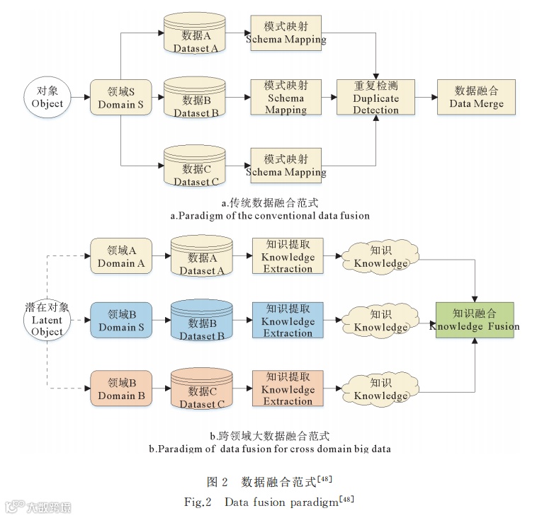 在海洋大数据时代,如何处理异构数据,从多源数据中进行分析挖掘是非常重要的研究课题,是整体数据流程中重要的一环。由于数据多源观测,数据的优势及完整性不同,对相关海洋大数据挖掘研究首先需要进行数据融合,使能够在一定程度上排除冗余与噪声、降低不确定性,提高信息的精确度和可靠性等[48]。Bahado等对多传感器数据融合方法及概念共性等作了综述[49],郑宇对跨领域的大数据不同融合方法进行讨论[48],并与传统的数据融合方法进行了对比,如图2所示,在大数据时代,对于跨领域的海洋大数据融合应首先进行分类知识提取,然后进行知识融合,这也与传统的融合方法不同。相关研究人员还研究了变分同化法、最优插值法、卡尔曼滤波等数据融合技术在海洋环境监测与预测方面的应用[50-52]。