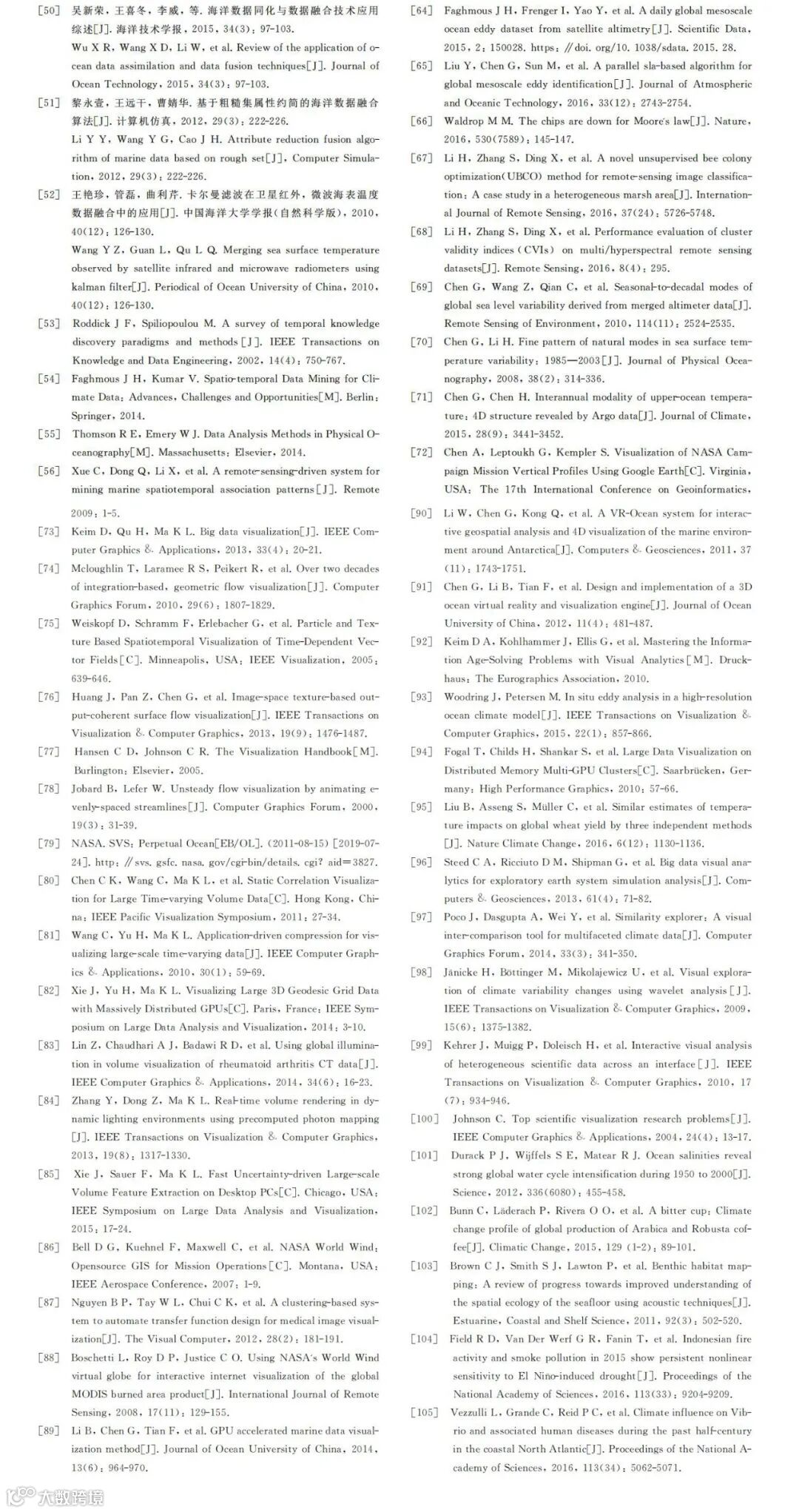 海洋数据的爆炸性增长给可视化带来了新的挑战。首先是数据体量及多维度的问题。当前针对大规模海洋数据可视化能力还较弱,相关研究亦是欠缺,大规模的数据单机绘制主要依赖于硬件加速、信号处理与特征表达等手段,例如利用GPU构建分布式计算与可视化架构,在大规模标量场数据上进行并行可视化[94]。针对多维数据分析中,结合信息可视化方法的多维科学分析应用是一个非常有前景的研究方向,目前已有在信息可视化领域常用的平行坐标坐标方法应用在海洋数据上的研究案例[95-97]。其次是可视化与海洋常规挖掘分析算法结合的应用问题。目前已有的结合分析如将小波分析结合可视化进行分析探索[98],将原位可视化应用于海洋模式的计算改进[97,99]。最后是可视化平台及架构的研发。Chris总结了科学可视化领域的面临的重要问题[100],其中指出集成的问题处理环境是始终存在的重要问题。目前的海洋数据可视化工具处理问题能力仍相对单一,扩展性不强,科学家所需要的不仅仅一个可视化结果,集成的交互处理方式及扩展分析架构,特别是对海洋多源异构数据的整合及对多种可视化算法综合利用仍是海洋大数据可视化面临的问题。