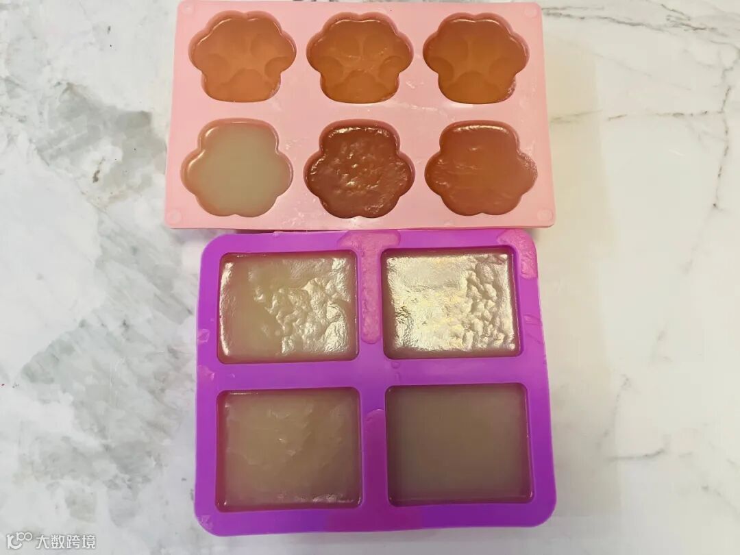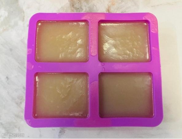 将混合液倒入肥皂模具中,待冷却凝固后,手工皂便制作好了。