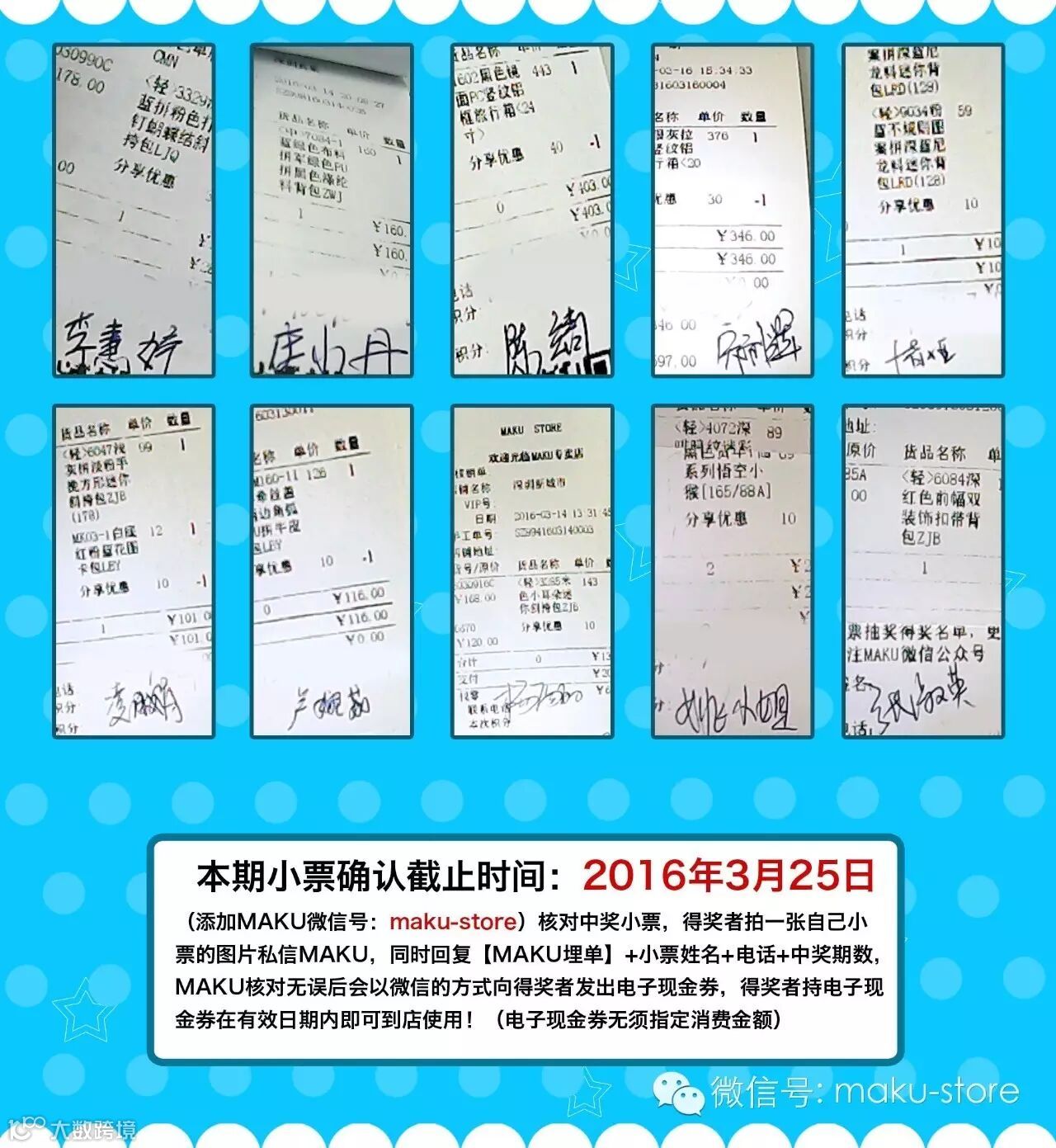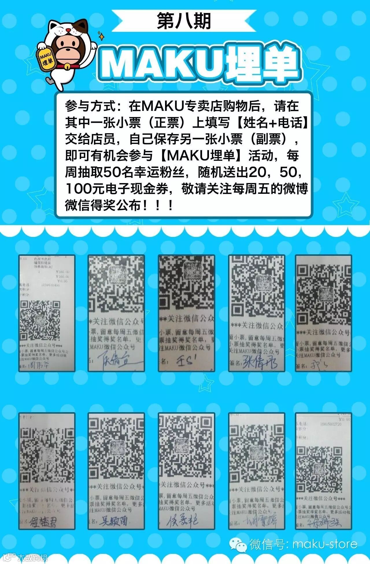 在MAKU专卖店购物后,请在其中一张小票(正票)上填写【名+电话】交给店员,自己保存另一张小票(副票),即可有机会参与【MAKU埋单】活动,每周抽取50名幸运粉丝,随机送出20,50,100元电子现金券(电子现金券无须指定消费金额),敬请关注每周五的微博微信得奖公布!!