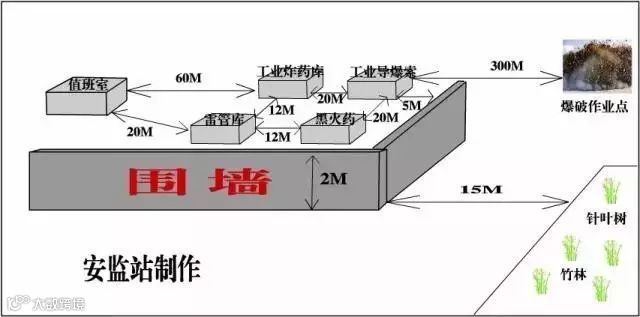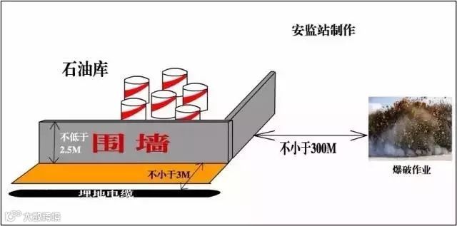 油库的围墙与爆破作业场地(如采石场)的安全距离,不应小于300m。《石油库设计规范》(GB50074-2014)4.0.12