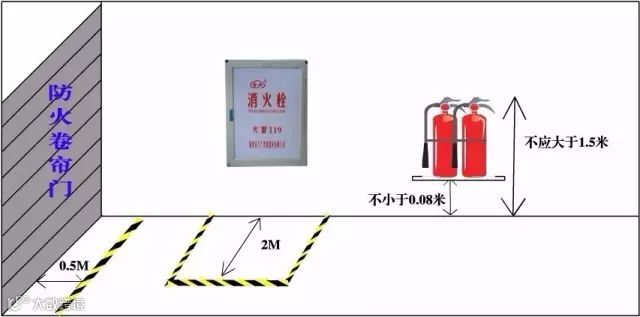防火卷帘门两侧各0.5m范围内不得堆放物品,并应用黄色标识线划定范围。《人员密集场所消防安全管理》(GA654-2006)8.3.7