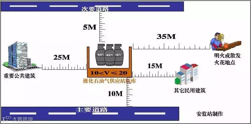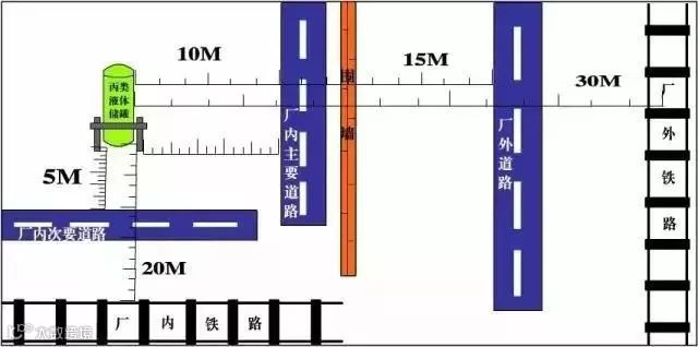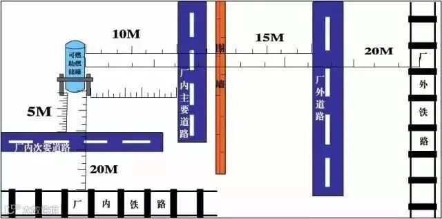 可燃、助燃气体储罐与厂外铁路中心线、厂内铁路中心线、厂外道路路边、厂内主要道路路边和厂内次要道路路边的防火间距不应小于25、20、15、10和5米。《建筑设计防火规范》(GB50016-2014)4.3.6
