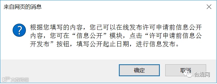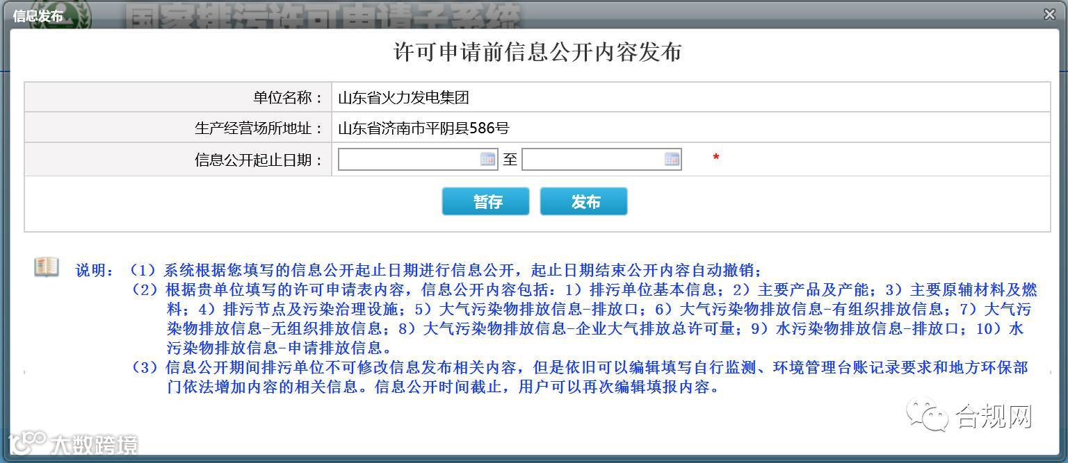 ► 点击“许可申请前信息公开发布”按钮,填写发布起止时间。