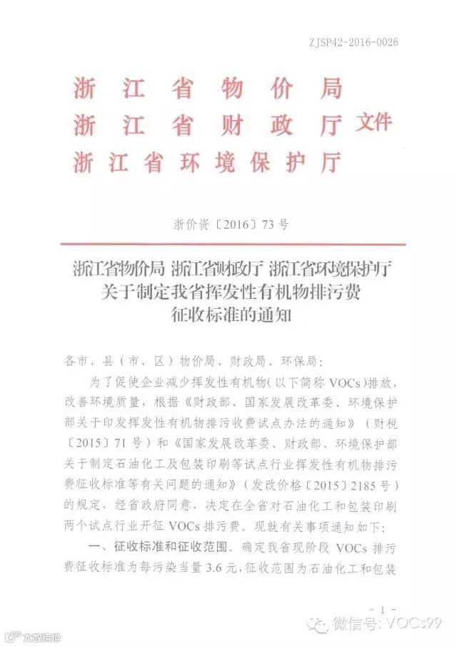 关于制定我省挥发性有机物排污费征收标准的通知(浙价资[2016]73号)