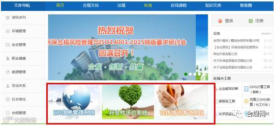 操作:与合规网联系后,合规网给出账号和密码,企业人员点击EHS信息管理系统/符合性评价系统/在线培训考试系统,即可进入学习或管理。