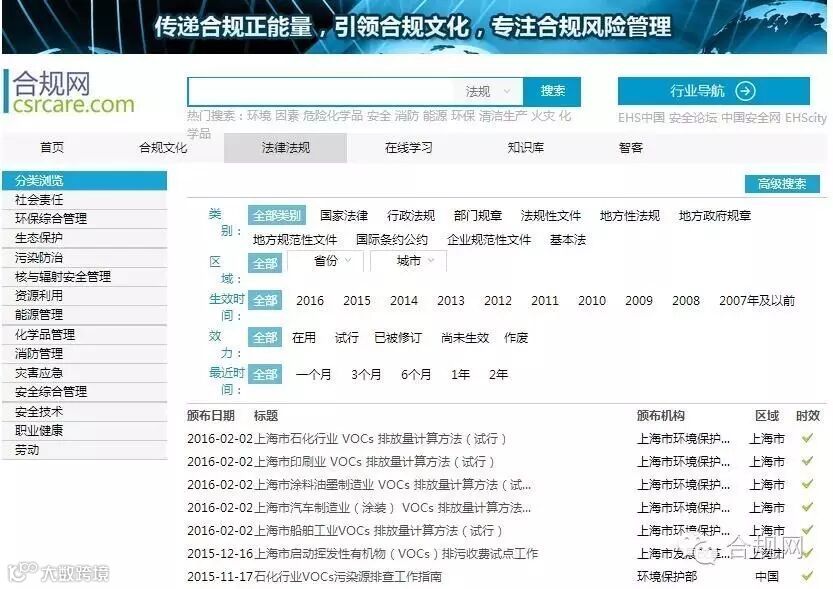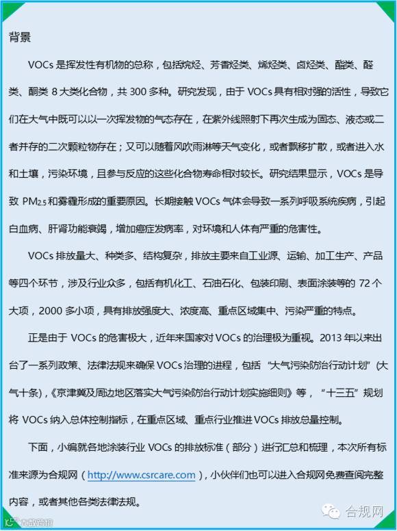 “十三五”规划纲要将VOCs新纳入总量控制指标,并提出VOCs在重点区域、重点行业推进挥发性有机物排放总量控制,全国排放总量下降10%以上。截至2016年6月,北京、上海、江苏、安徽、湖南、四川、天津(直辖市)、辽宁、浙江、河北和山东等十一个省份及直辖市先后正式发文试点征收挥发性有机物VOCs排污费,具体可在合规网(http://www.csrcare.com)免费查阅。
