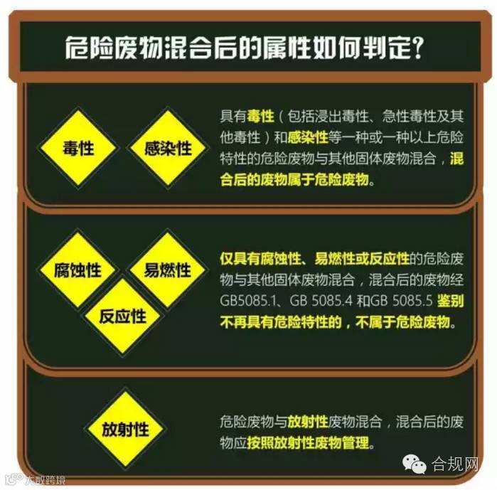 当废弃物为危险废物与其他固体废物的混合物时,须首先分辨该混合物中的已知危险废物是否具有毒性(包括浸出毒性、急性毒性及其他毒性)和感染性中一种或一种以上危险特性,如具有上述危险特性,则该混合物直接判定为危险废物;如混合物中已知的危险废物仅具有腐蚀性、易燃性或反应性,则该混合物需经鉴别试验进行鉴定方可最终判定其是否为危险废物。