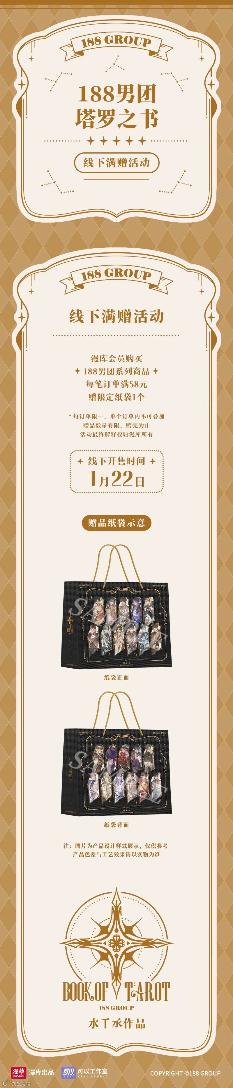 漫库会员在漫库指定打卡线下门店购入本次188男团系列商品每笔订单满58R,即赠限定纸袋1个(每订单限一,单个订单内不可叠加,赠品数量有限,赠完为止;活动最终解释权归漫库所有)