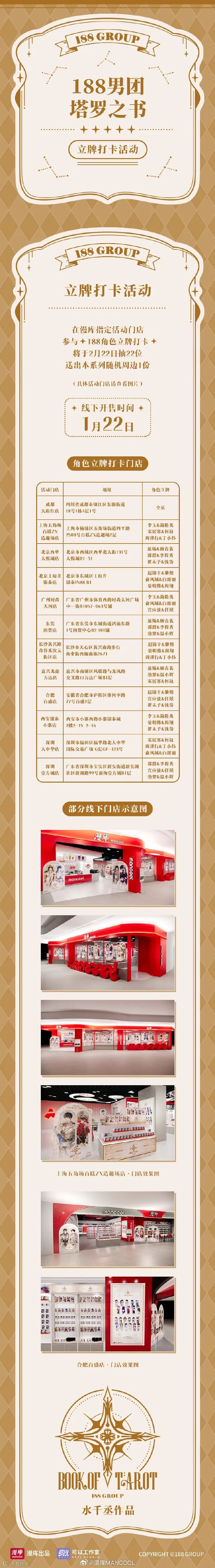 在漫库指定活动门店,带话题#漫库x188男团塔罗之书# 打卡188男团角色立牌,将于2月22日,抽22位送出本系列随机周边1份(具体活动门店请查看图片)