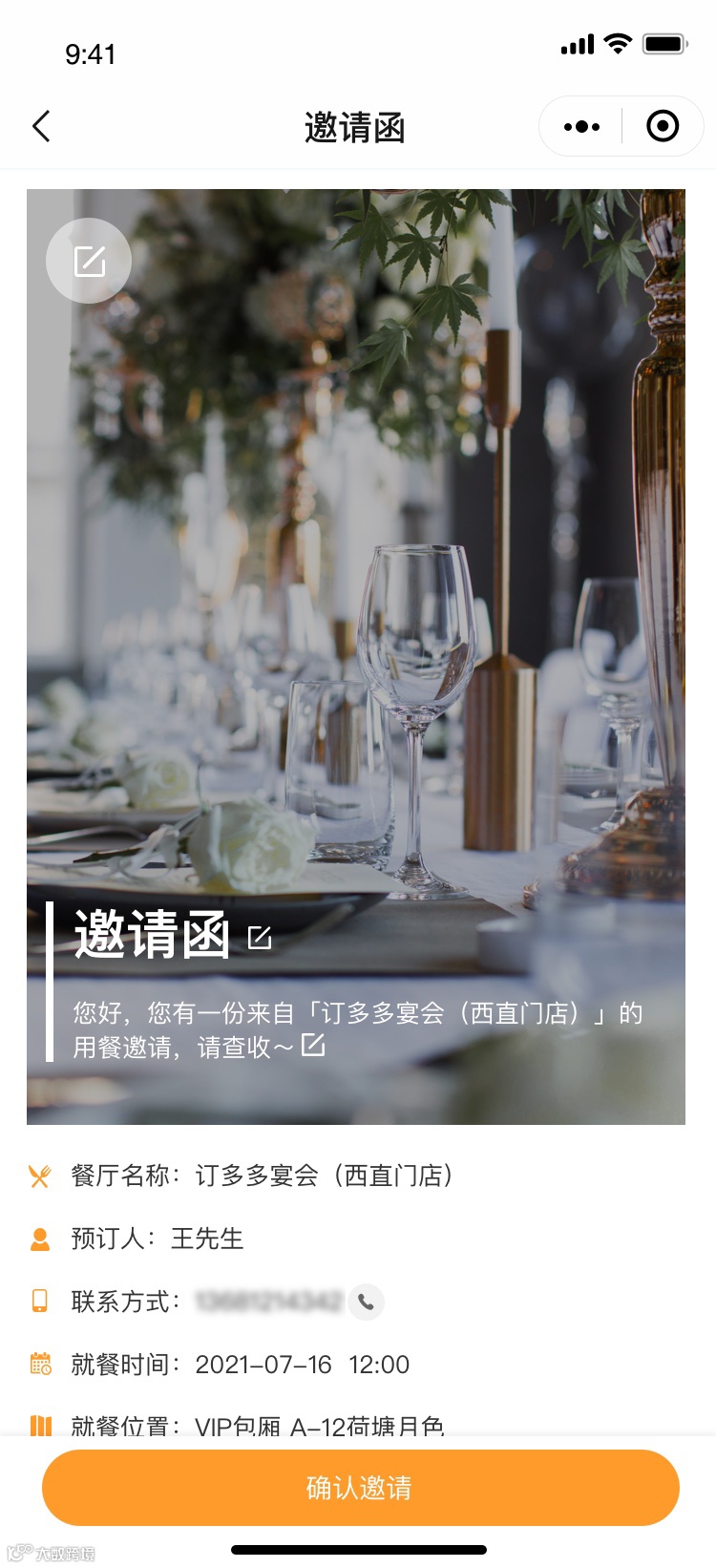 当顾客预订完成后,自动生成邀请函,顾客可以根据喜好对邀请函进行修改,然后一键发送给同行就餐的好友,预订详情即可同步,这种方式更便捷、更具有个性化,提高顾客的消费体验。